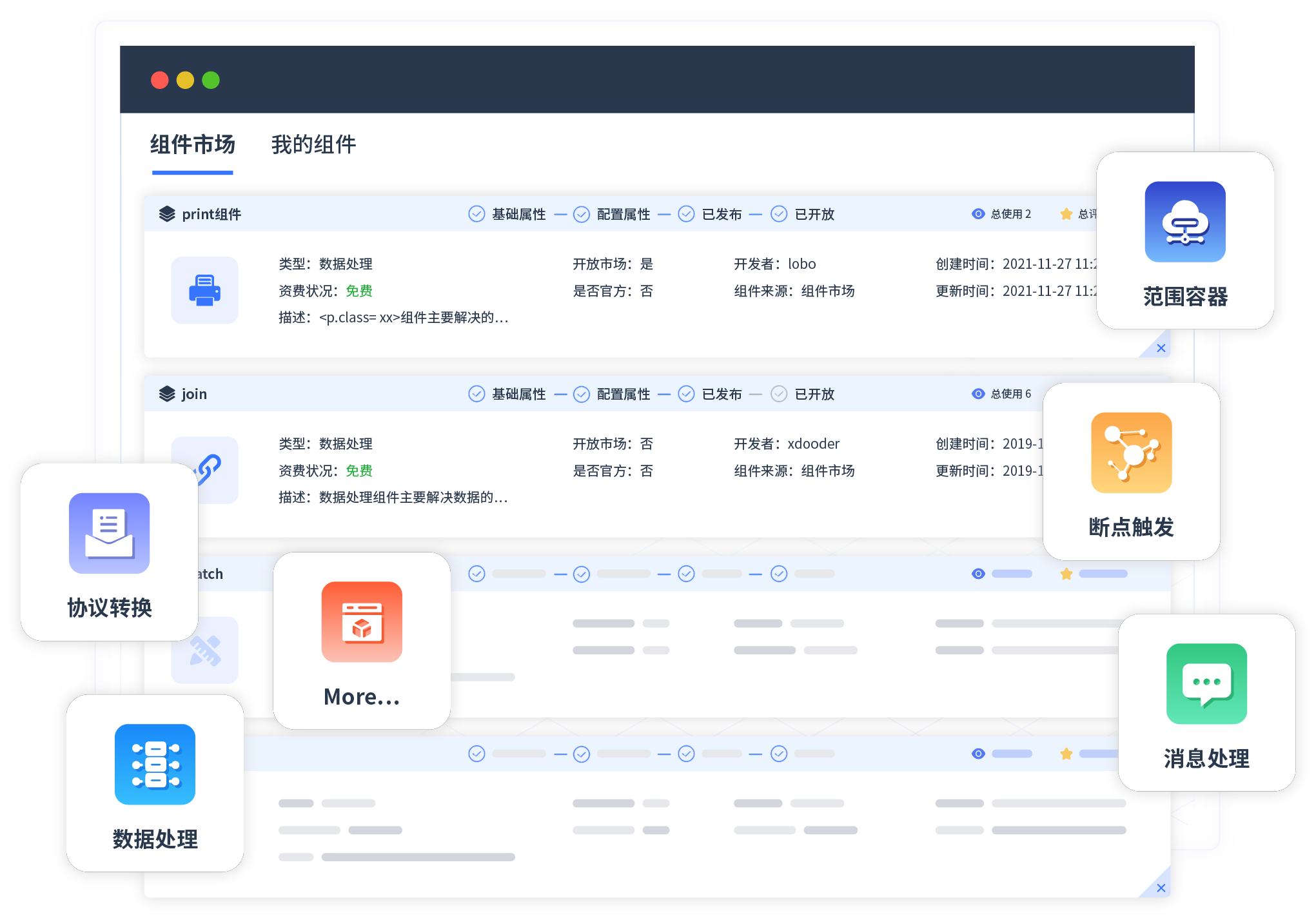 针对集成场景,,,,GOPAY钱包提供组件市场,,,,例如协议转换、、、消息处理、、、、文件操作等。。。除平台提供的组件外,,,客户可以自定义所需组件。。