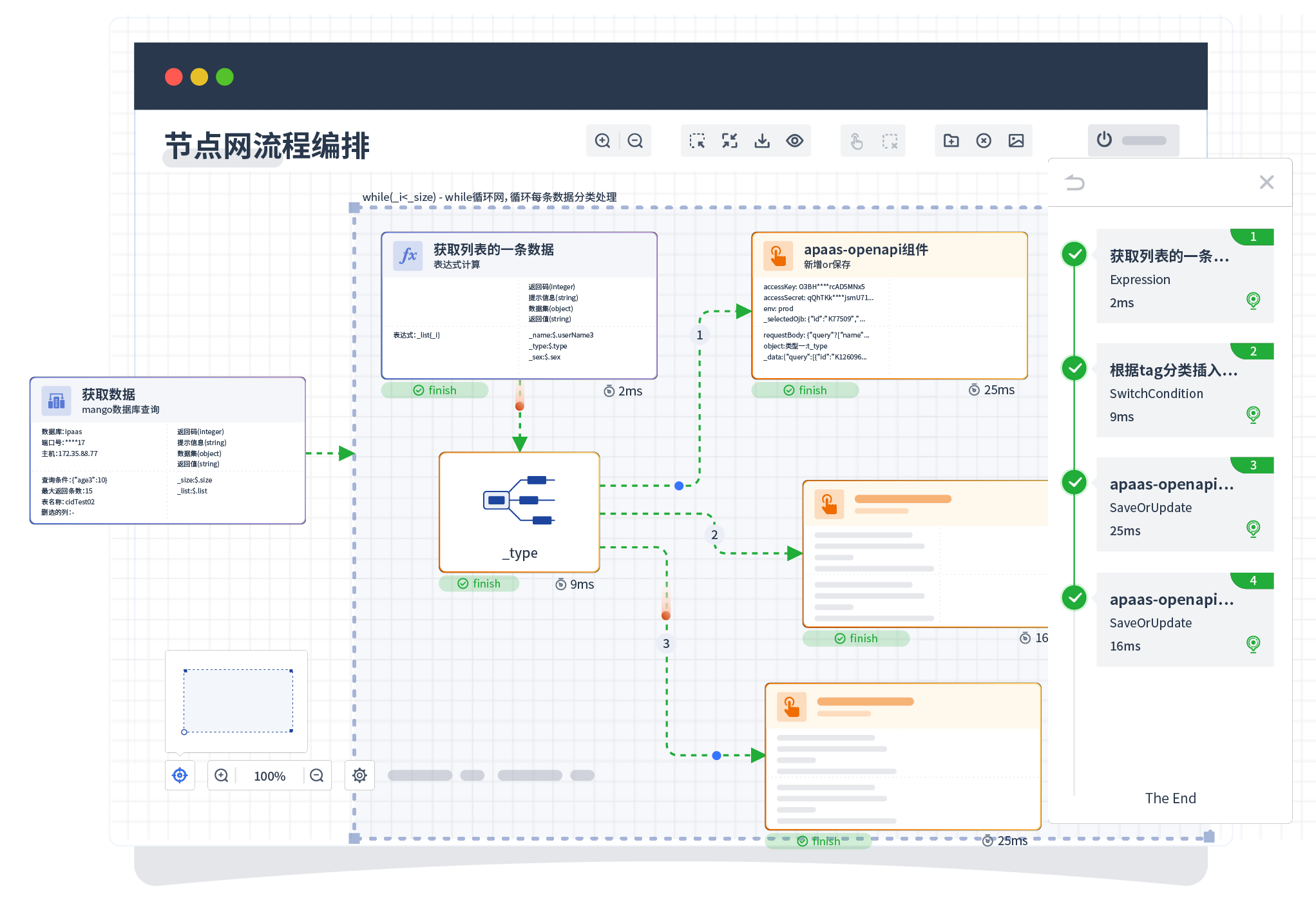 针对集成场景,,,组件定义后支持进行流程编制,,不同于传统代码方式,,通过图形化展示,,支持在线调试、、、日志查看和运行回放。。。